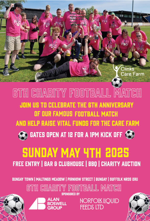 Football Match is a fun event where players with a range of abilities enjoy playing a football match on the main pitch at Bungay Town Football Club. BBQ and refreshments available. A grand charity auction will follow the match